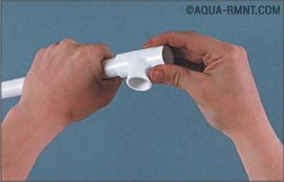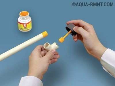 После обезжиривания поверхности склеиваемых деталей наносят кисточкой тонкий слой клея Перед тем как наносить клей для пластиковых труб на помеченные участки, проводят обезжиривание и очистку их поверхности с помощью очистителей, выпущенных тем же производителем. Перед применением клей тщательно перемешивают. Затем наносят ровный и тонкий слой клея кисточкой на раструбы соединительных фитингов, а затем на трубу в продольном направлении. Вставляют пластиковую трубу в отверстие фитинга до упора, ориентируясь по меткам, сделанным маркером во время примерки, при этом не вращают детали и не покачивают. Несколько секунд (15 и более) стараются жестко удерживать склеиваемые детали, чтобы клеящее вещество начало подсыхать.