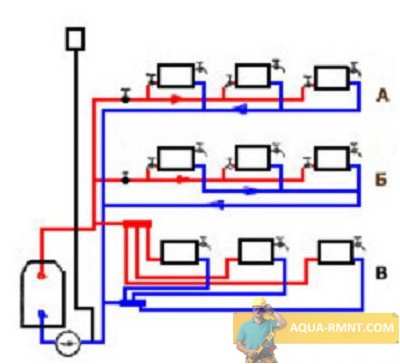 Три схемы устройства горизонтальной двутрубной системы отопления в частном доме: А) тупиковая; Б) попутная; В) коллекторная (лучевая) Сразу отметим, что наибольшей эффективностью обладает последняя, а именно коллекторная разводка труб. Однако при ее воплощении увеличивается расход материалов, а также трудоемкость выполнения монтажных работ.