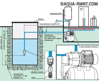 Вариант схемы подключения при водоснабжении из скважины или колодца Обратите внимание! Если глубина скважины (колодца) не превышает 10 м, то актуальной будет однотрубная модель станции. При глубине от 10 до 20 м, предпочтение стоит отдать двухтрубной станции с эжектором. Естественно, прежде чем приступить к монтажу должна быть разработана схема установки насосной станции, которая и будет реализована на практике.