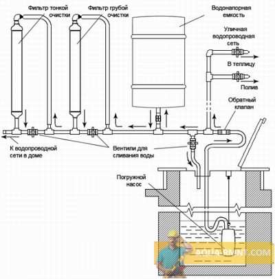 Схема устройства децентрализованного водопровода на даче. Вода, поступающая в дом для питья, подвергается двухступенчатой степени очистке через систему фильтров Важно! Схема устройства водопровода на даче должна храниться у хозяина участка. Ведь со временем можно забыть, где проходят трубы. Информация о месте расположения элементов трубопровода пригодиться для ремонта его участков, а также при проектировании строительства других сооружений на даче. При продаже участка наличие схемы водопровода повысит привлекательность сделки.