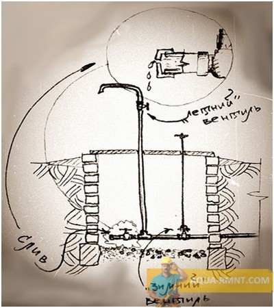 Можно обеспечить водоснабжение дачи в течение круглого года, используя совсем простую схему. Конечно, этот вариант не является идеальным, но, все же, помогает решить проблему при минимальных финансовых затратах. Внимательно изучите эскиз данной схемы, приведенный ниже. Секрет кроется в том, что в период зимней эксплуатации водопровода через небольшое отверстие в дополнительном сливе постоянно вытекает вода в приямок и впитывается в грунт. Это позволяет воде не замерзать в трубопроводе. В летнее время зимний вентиль держат открытым, используя только «летний» вариант. Важно! Минусом этой простой схемы устройства дачного водопровода можно считать постоянную влажность в приямке. Однако с этим можно смириться, ведь вода-то будет на даче круглый год.