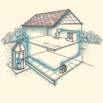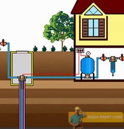 Схема монтажа водоснабжения частного дома из скважины, пробуренной до водоносного горизонта лицензированной компанией с помощью мощной роторной буровой установки Заводят трубу и кабель в дом. В доме ставят: бак, который позволит включать насос по мере необходимости; блок управления, предназначенный для защиты системы от перепадов напряжения в сети, а также от перегрева.
