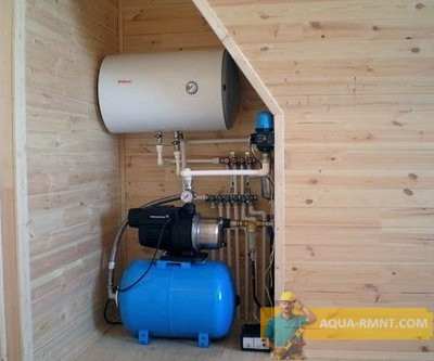 Оборудование для обеспечения горячего и холодного водоснабжения частного дома компактно размещается в подвальном или любом подсобном помещении объекта Важно! Перед всеми видами оборудования, используемого в системе водопровода, необходимо устанавливать запорные краны. Это позволит отключать приборы от системы для проведения их ремонта или замены, не нарушая снабжение водой всего дома. Водоснабжение частного дома может быть организовано с помощью двух видов насосов: поверхностные модели, не погружаемые в источник водозабора, обеспечивают подъем воды с глубины 8-9 метров, потому их используют в колодцах; погружные модели размещают непосредственно в самом источнике водозабора (скважине или колодце), при этом их мощность позволяет поднять воду на высоту более 200 метров.