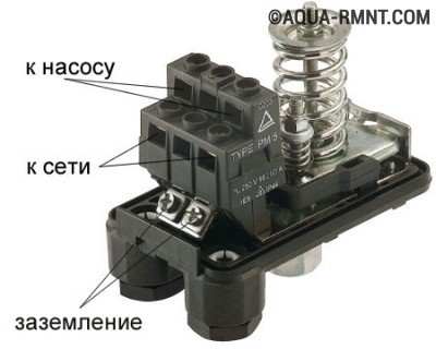 На фото наглядно представлено расположение контактных пар, к которым подводят электропитание. При достижении максимального значения давления контакты размыкаются и насос отключается Обратите внимание! Для подключения реле к электросети рекомендуется использовать кабель, характеристики которого соответствуют мощности насоса. Теперь следует прикрутить жилы провода к свободным контактам каждой пары. Не следует соединять таким образом контакты одной пары, поскольку это приведет к короткому замыканию. Провод заземления соединяют со специальным винтом на корпусе реле. Этот винт обозначен соответствующим символом.