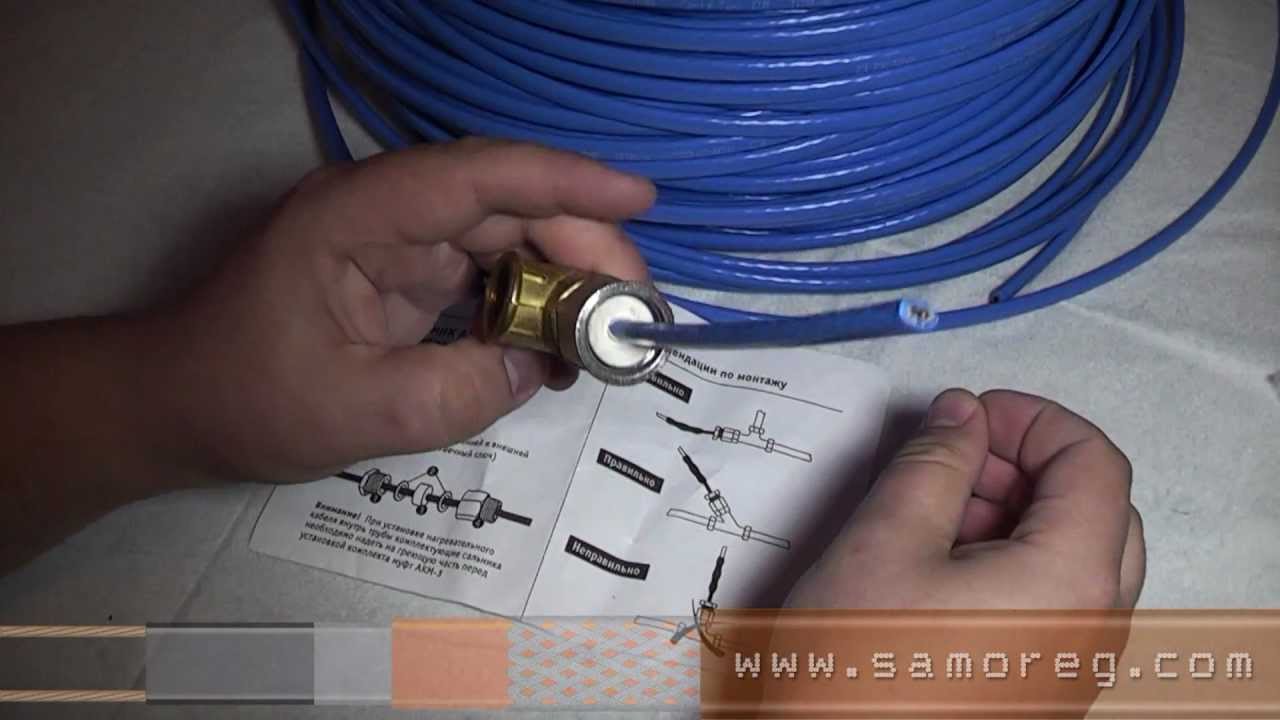 Монтаж саморегулирующегося греющего кабеля внутрь трубы идет через сальник Важно! Если подведен в трубу сверху, то фиксация его положения не требуется. Если же нагревательный элемент подводится снизу, то для недопущения его сползания, требуется надежная фиксация. Чтобы установить греющий кабель внутри трубы, надо точно измерить длину участка трубопровода, нуждающегося в подогреве. Запрещается осуществлять прокладку нагревательного кабеля сквозь запорные вентили. Место установки системы обогрева водопровода отмечают предупредительной надписью. Все действия при вводе кабеля в полость трубы должны проводиться с особой аккуратностью и вниманием, так как нельзя допустить повреждения его внешней оболочки. Резьбу на фитингах в процессе установки лучше закрыть заводской лентой, как и другие острые предметы.