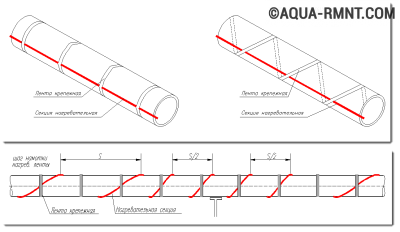 Расположение нагревательного кабеля по спирали с определенным шагом 5. Несколько вариантов расположения греющей ленты на отдельно взятых элементах трубопровода (вентилях, коленах, фланцах и других участках).