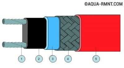 Схема пятислойной конструкции греющего кабеля: 1 — медные провода большого сечения; 2 — саморегулирующийся токопроводящий материал; 3 — изоляция из модифицированного полиолефина / фторполимера (FS-C-2X); 4 — оплетка из луженой меди для дополнительной защиты; 5 — наружная изоляция из модифицированного полиолефина Каждый участок самонагревающегося кабеля способен приспосабливаться к внешним условиям, причем это никаким образом не отражается на работе других его частей. За счет нормирования тепловыделения для стандартизованных условий, указываемых в наименовании кабеля, система обогрева не может на практике перегреться в принципе. Наличие двух слоев изоляции позволяет обеспечить изделию: диэлектрическую прочность; защиту от истирания и ударных нагрузок; влагоустойчивость; защита от воздействия химических соединений. Важно! Резистивный кабель для обогрева труб на четверть дешевле саморегулирующих нагревательных изделий, зато они более надежны и экономичны в эксплуатации. Дело в том, что саморегулирующийся кабель может увеличивать мощность при снижении температуры, а при ее повышении — автоматически отключаться.