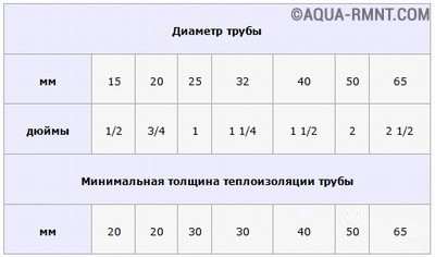 Установка системы защиты водопровода от перехватывания и замерзания позволяет укладывать трубы выше уровня промерзания грунта. В некоторых случаях глубоко зарыть трубопровод в грунт невозможно по объективным причинам. Трубы, дополнительно обогреваемые электрокабелем, нуждаются в теплоизоляции. Это помогает снизить теплопотери и экономно расходовать потенциал греющего элемента. Толщина теплоизоляционного материала зависит от диаметра труб. Рекомендуемые значения данного параметра приведены в таблице: