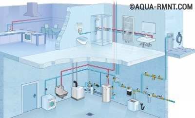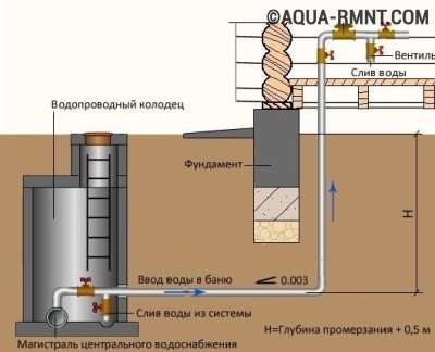 Таким образом выглядит полноценная система водоснабжения частного дома, питающаяся от центральной магистрали; важно ее совместить с другими коммуникациями Важно! Перед началом работ необходимо выяснить, какие еще коммуникации проходят на этой глубине, чтобы не повредить их. Для врезки применяют специальную накладку в хомуте. Ее устанавливают на зачищенное ровное место трубы. Металлические части зачищаются наждачкой, при этом удаляется ржавчина и краска. На другом конце накладки устанавливается задвижка с втулкой, где располагается сверло. Выполнив сверление магистрали, сверло и втулка извлекаются, а задвижка параллельно перекрывается. Трубу ввода подсоединяют к фланцу на задвижке. Обязательно следует предусмотреть уклон 2% на участке трассы от врезки до входа отводящей трубы под фундамент в сторону магистрального трубопровода. Правильное расположение водомерного счетчика, регистрирующего количество поступающей воды, предполагает, чтобы отсекающие вентили находились: один – перед ним, другой – после счетчика. Прибор учета расхода воды может располагаться как в колодце, так и быть вынесен в помещение. Запорный вентиль отключает и включает ее подачу.