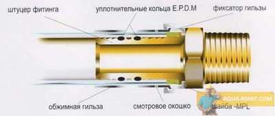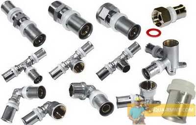 Все модели пресс фитингов устроены приблизительно одинаково. Схематично их устройство представлено на рисунке Ассортимент данных деталей очень широк, что позволяет создавать разводку любой конфигурации. Для монтажа линейного трубопровода используются переходники и соединительные муфты. Для разветвлений и поворотов применяются различные отводы, уголки, тройники и крестовины. Так же использование комбинированных пресс фитингов дает возможность подключаться не только к металлопластиковым, но и стальным трубам обычной металлической и запорной арматуры. Для соединения деталей одинакового диаметра применяются муфты. Для элементов из различных материалов или разного размера используются переходники. Они могут быть различных типов. При этом на патрубок пресс фитинга, на который будет устанавливаться труба из металла, нарезается резьба. Она может быть внешней или же внутренней. Кроме того унификация фитингов позволяет подключать металлопластиковые трубы к медным трубопроводам.